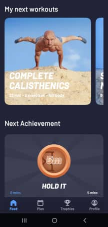The main page is the feed page. You can see the very next workout for your programs at the top, followed by the achievement you are working toward. Tapping on the workout(s) brings you to the exercise environment where you can start the workout.