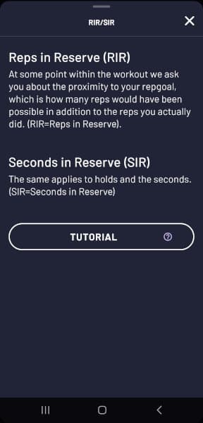 During the explanation, you are given the name of the exercise and an animation of the movement. You are also given your target repetitions and your RiR (Reps in Reserve) or SiR (Seconds in Reserve).