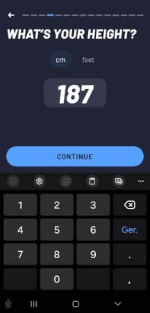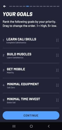 When you start the app for the first time, you’ll be presented with a personalized setup. You’re asked to fill in your sex, age and height. After that, you can arrange your goals by priority, and you are asked to estimate your performance for a couple of exercises.