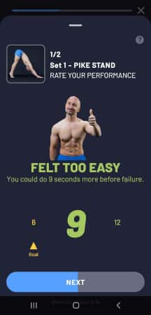After each exercise, you are asked to rate your performance by indicating how many repetitions you could feel you could still do (remember, never exercise to failure or do more repetitions than asked for). You must try to be as accurate as you can. The Cali Move App uses this information to adjust the progression.